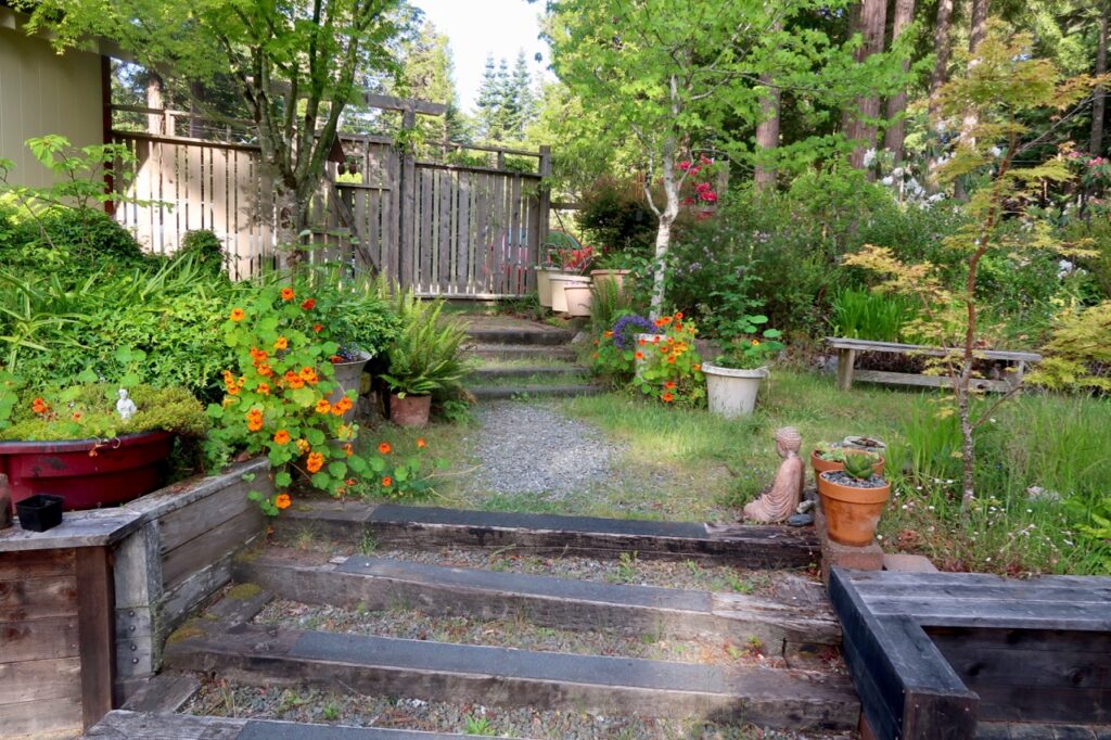 We’ve lived in our house on two acres near the town of Mendocino for thirteen or fourteen years now. For our first eight or nine years here we did not have any nasturtiums growing anywhere on the property. Then one day my friend JB sent me a little packet of nasturtium seeds from his nasturtiums and I planted them in my tubs and pots in which I grow roses, and I also planted a few seeds in one of my orchard tubs where I grow lettuce and radishes and sometimes potatoes. Now nasturtiums grow here year round, planting themselves exactly wherever they want to be.
