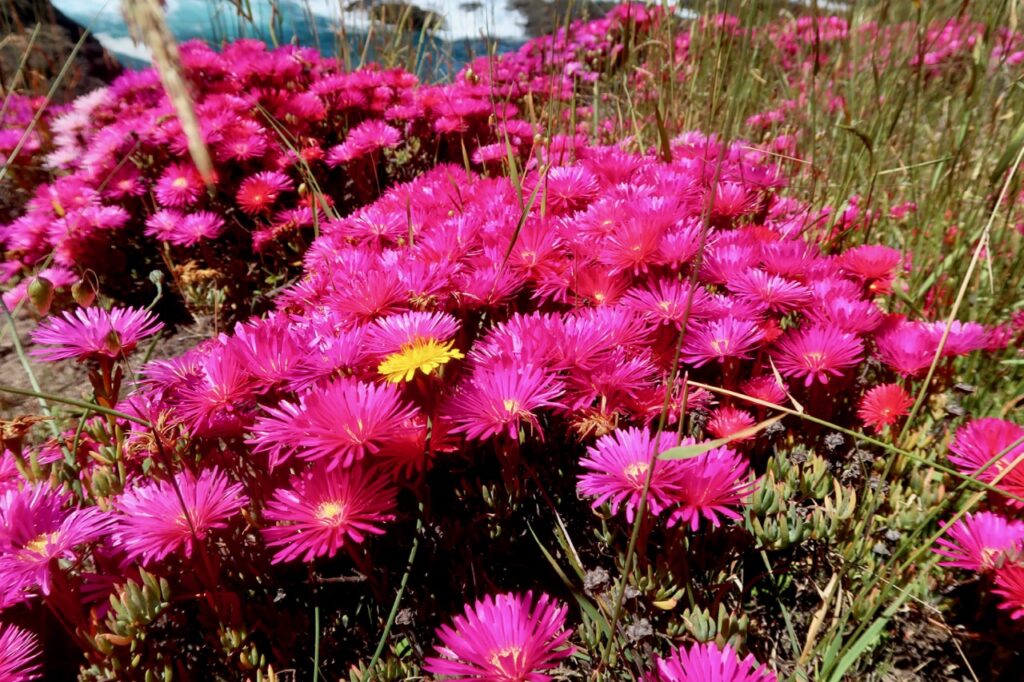 Every year for just a few weeks on one little section of cliff on the headlands south of the town of Mendocino, these magenta flowers appear. This is their actual color, and unlike the invasive ice plant that spreads everywhere and is an ecological scourge up and down the California coast, this variety hasn’t spread beyond this little section of cliff in the twenty years I’ve been walking here and actually keeps the cliff from eroding.