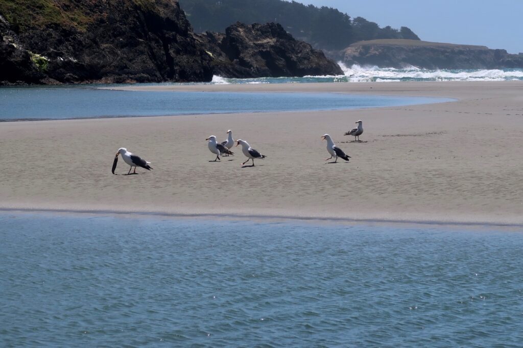 We were on the beach at the mouth of Big River and came upon these gulls making a big fuss about one of the gulls having a fish and the other gulls not having a fish. We didn’t see who caught the fish, and it may have been that the gull with the fish stole it from the gull who caught the fish. In any case, when the gull with the fish started eating the fish, two ravens arrived, more gulls came, chaos ensued, and we didn’t stay to see what happened because it was cold despite being a sunny morning and I hadn’t worn a jacket.
