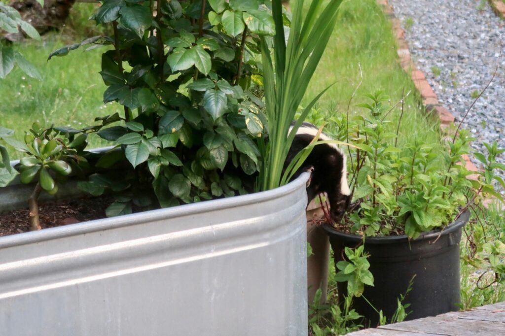 At dusk of late, a skunk comes walking across the deck, has a long drink from the white bowl full of water near our stone statue of Ganesh, and then he or she jumps into the trough in which I grow pink and yellow roses. Generally speaking, I don’t want skunks in my troughs and tubs where I grow things because they tend to dig things up in search of worms and make a mess. And in the case of my tubs and troughs where I grow vegetables, they dig up the plants. But in this case, the skunk eats sow bugs that proliferate in this particular tub, and I appreciate the excellent job he or she does ridding me and my roses of these voracious pests.